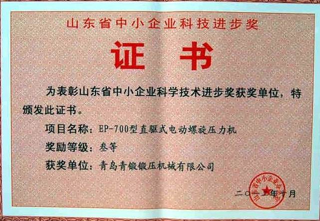 2012年,EP-700型直驅式機獲山東省級科技進步三等獎。